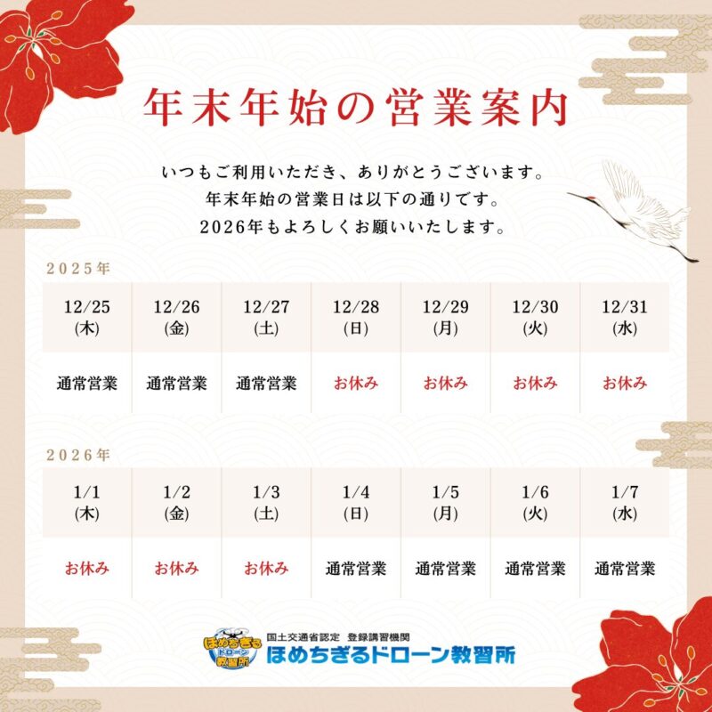 ほめちぎるドローン教習所の年末年始の営業日をご案内いたします。